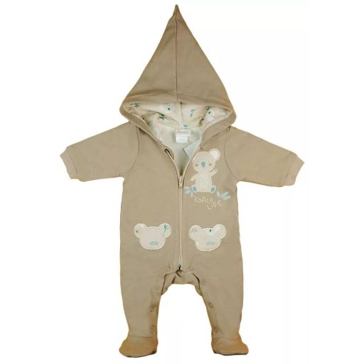 Koalás mintával nyomott, elöl cipzáras, lábközött patentos, kapucnis pamut béléses baba overál.
