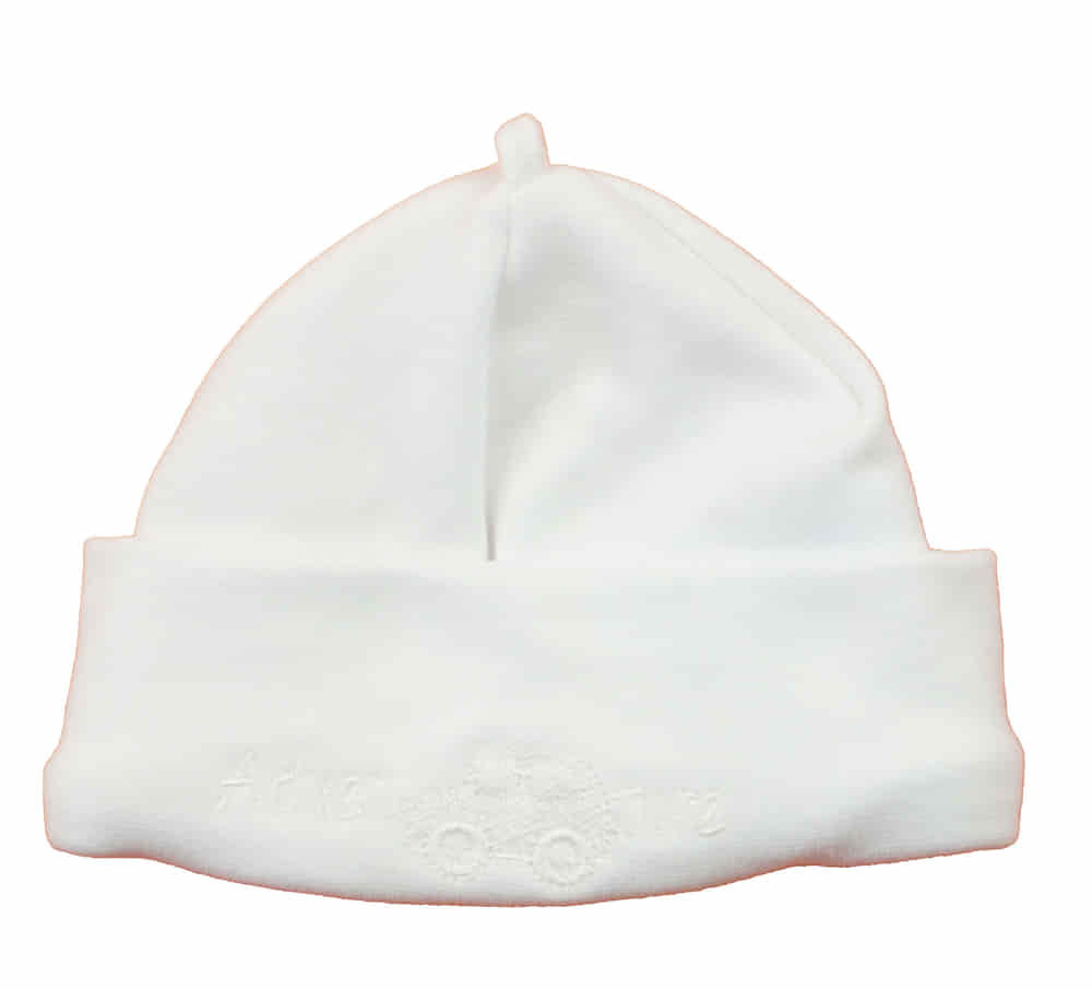 Autó mintával hímzett, fülvédős, megkötős, vékony pamut, baba sapka