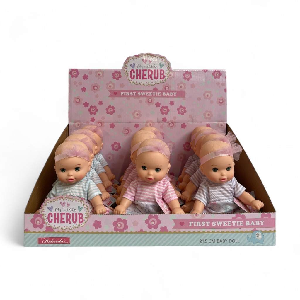 Baba, hagyományos, csecsemő, merev szemű, kemény testű, 3 szín, 21 cm, 12/disp.