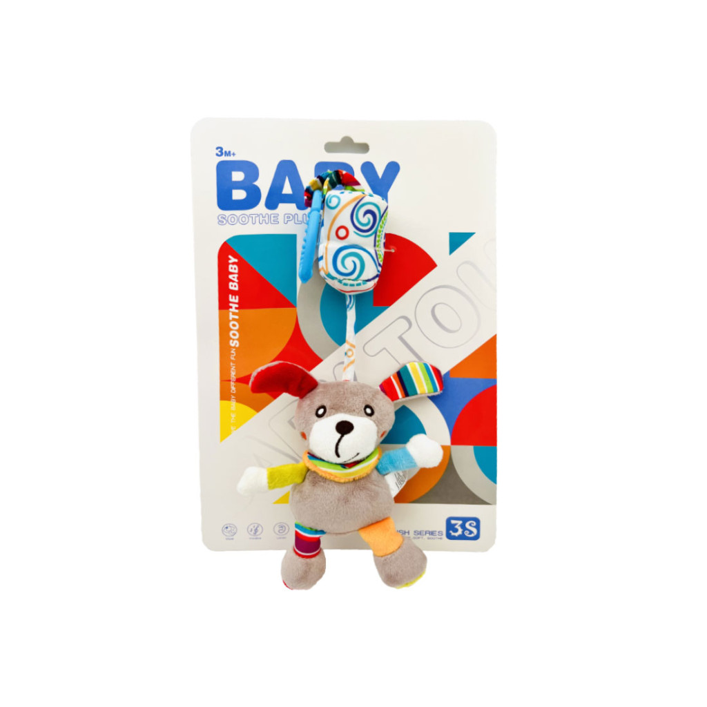 Bébi plüss kutya, csörgõ, bim-bam, akasztó, 34x22 cm lapon