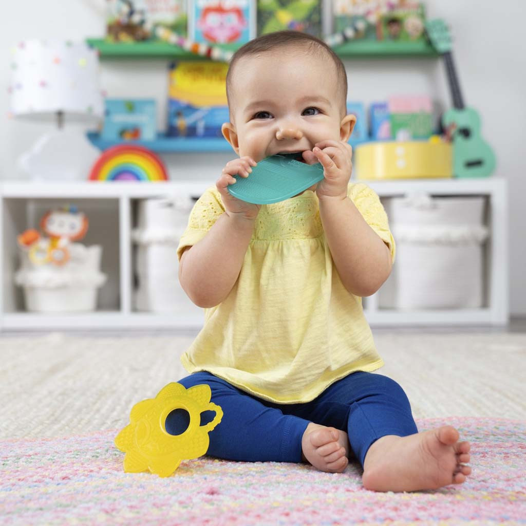 A fájó fogíny megnyugtatása sosem volt még ennyire egyszerű az új Bright Starts Sunny Soothers napocska és jégkrém formájú rágókáival. A sörtés kialakítás masszírozza kisbabád fogínyét, mikor megjelennek első fogacskái.