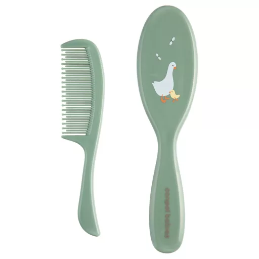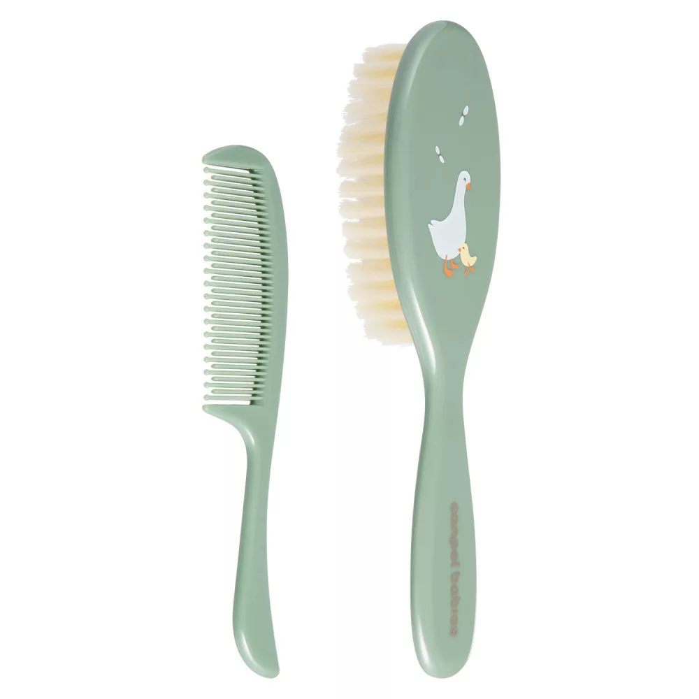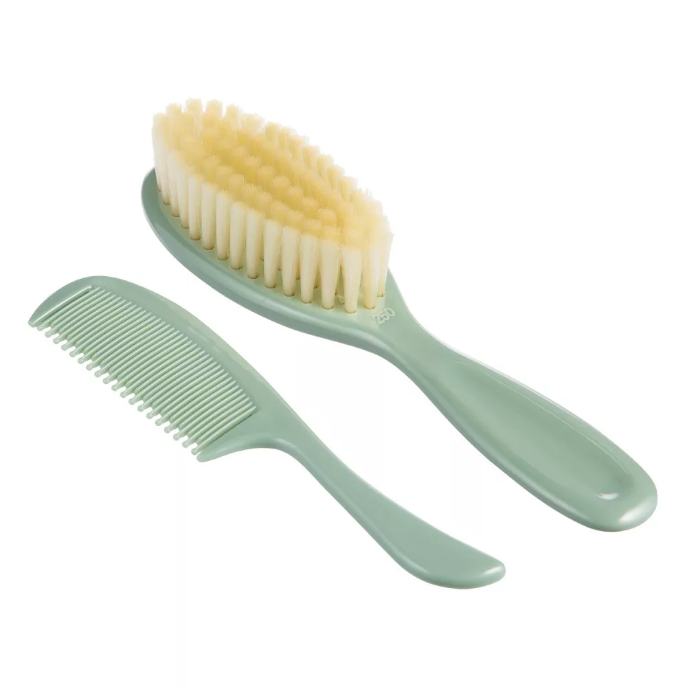 A szett egy puha sörtés hajkefét egy fésűt tartalmaz a baba hajának mindennapi ápolásához. A fésűnek lekerekített fogai vannak, amelyek nem irritálják a baba érzékeny bőrét. A kefe gyengéden masszírozza a baba fejét anélkül, hogy a hajat feltöltené elektromosággal. Tökéletes a születés utáni első napoktól kezdve. Többféle színben kapható.