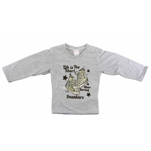 A hosszú ujjú Sneakers fiú póló a tökéletes választás a kis felfedezők számára. A szürke színű, 100% pamutból készült póló igazi alapdarab a hétköznapokra, legyen szó óvodáról, játszótérről vagy a családi kirándulásokról. A magyarországi gyártású póló kényelmes és praktikus viselet, amely egy farmernadrággal kombinálva igazán csibészes megjelenést kölcsönöz a gyerkőcöknek. Az anyaga könnyen kezelhető, jól mosható, szín- és formatartó, így hosszú távon is megőrzi minőségét. Az I. osztályú minőségi magyar termék, amely garantáltan megfelel minden igénynek.