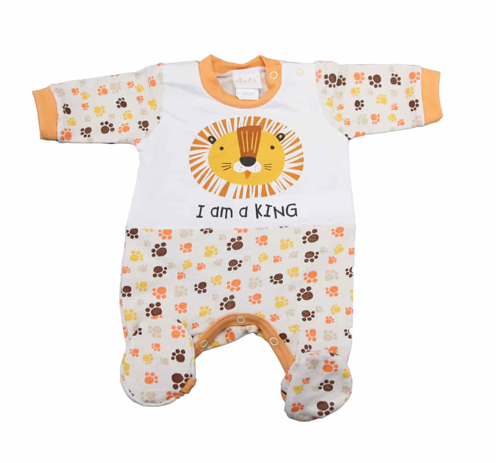 Kényelmes és nagyon cuki ez a hosszú ujjú pamut baba rugdalózó elején aranyos Oroszlán mintával, és kis tappancsokkal. Könnyű, vékonyabb 100% bababarát anyagból készült, kényelmes viseletet biztosítva egész napra. Vállán patentos, így megkönnyíti a picik öltöztetését. A lába közötti patentos megoldás a peluscserénél nagy segítség. Jól mosható, szín- és formatartó anyagból készült.