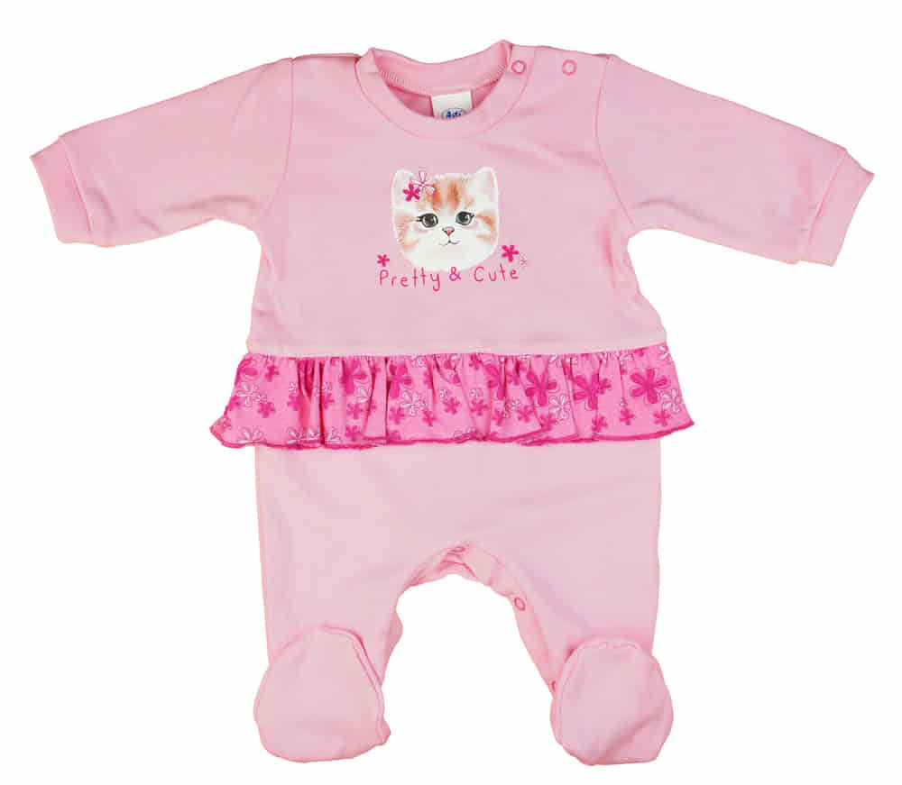 Ennek a hosszú ujjú fodros baba rugdalózónak az aranyos cicás mintája azonnal elvarázsolja a kicsiket és szüleiket egyaránt. A rugdalózó rózsaszín színben pompázik, amely minden kisbaba bőrét gyönyörűen kiemeli. A pamut anyagának köszönhetően a rugdalózó kényelmes és puha, így a babák egész nap jól érezhetik magukat benne.