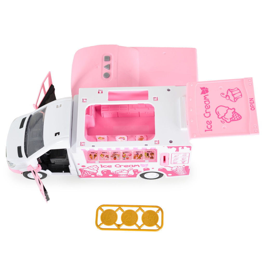 Ez a vidám, rózsaszín fagylaltos kocsi remek szórakozást kínál a gyerekeknek. A fény- és hanghatások életre keltik a játékot, miközben a nyitható ajtók és az érmés fizetőrendszer még izgalmasabbá teszik a szerepjátékot.