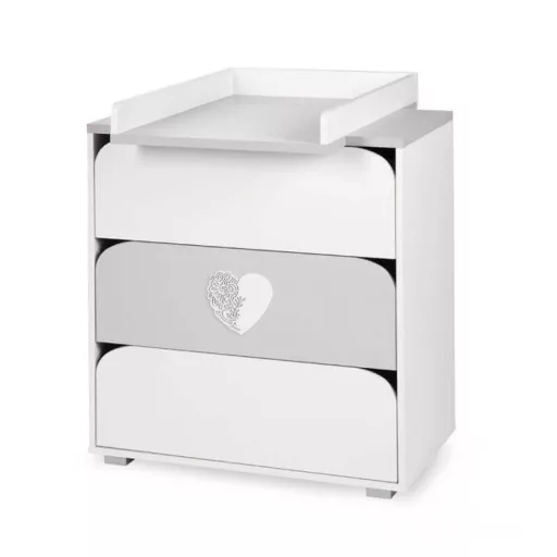 Praktikus, 3 fiókos kialakítású pelenkázó komód. A későbbi években a pelenkázó feltétet leszerelve egyszerű komódként, vagy éjjeli szekrényként használhatjuk. A szívecskés motívum és a komód különleges designja igazán egyedi hangulatot teremt a baba rezidenciáján.