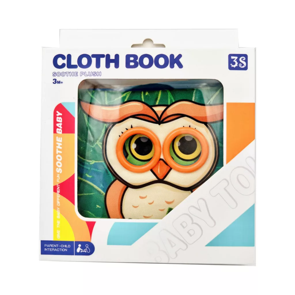 Lapozós textil könyv, csipogós, baglyos, 17x17 cm dob.