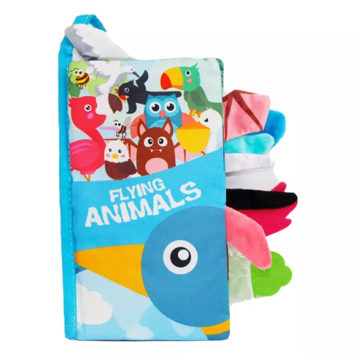 Lapozós textil könyv, repülõ madarak, állatok, kilógó farkakkal, 13x22+ cm zacsk.