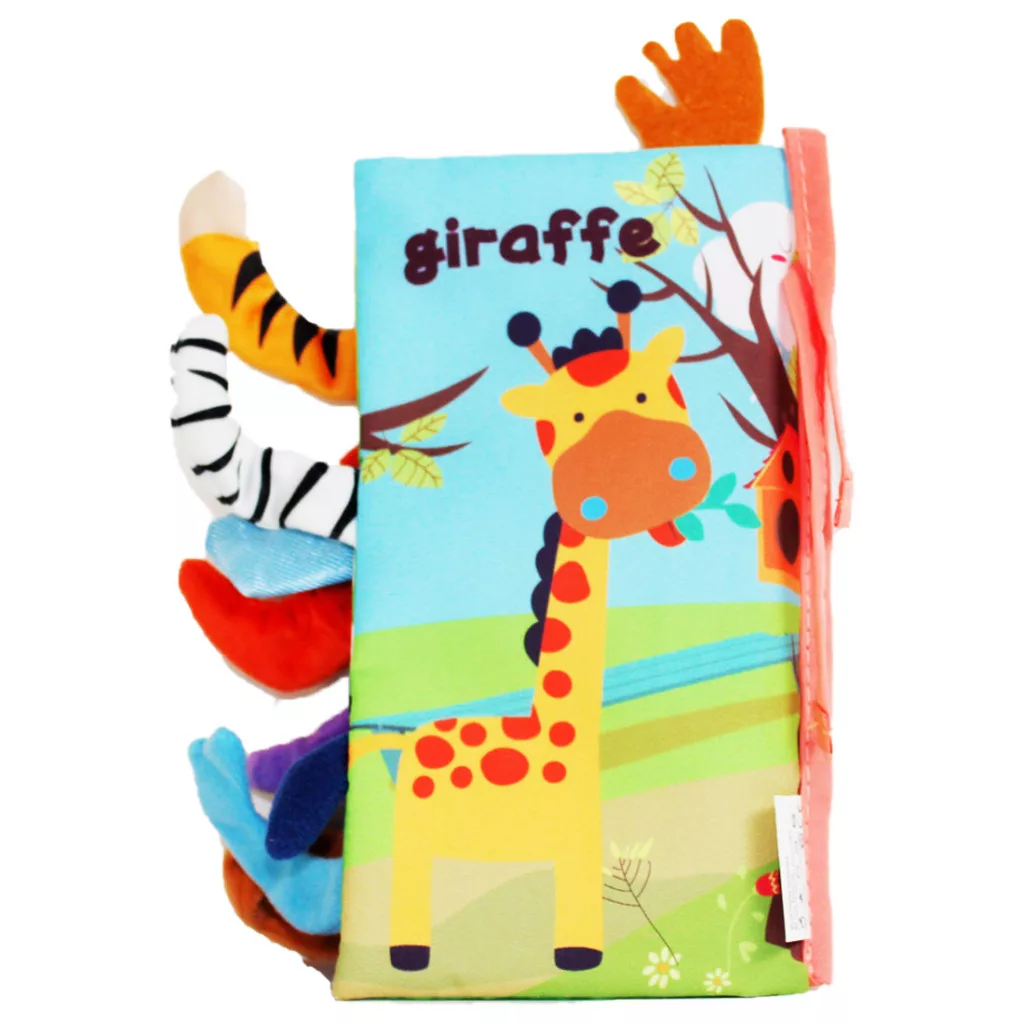 Lapozós textil könyv, vadállatok, kilógó farkakkal,13x22+ cm zacsk.