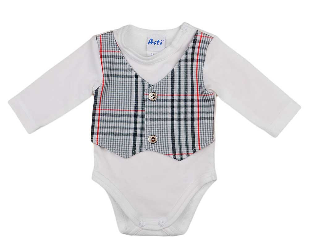 Kényelmes, elegáns és praktikus - ez a mellényes hosszú ujjú baba body mindent kínál, amire egy kisfiúnak szüksége lehet. A szürke szín univerzális és stílusos, míg a rávarrt mellény extra eleganciát kölcsönöz. A vállon található patentok megkönnyítik a fel- és levételt, így a babázás még sosem volt ilyen egyszerű.