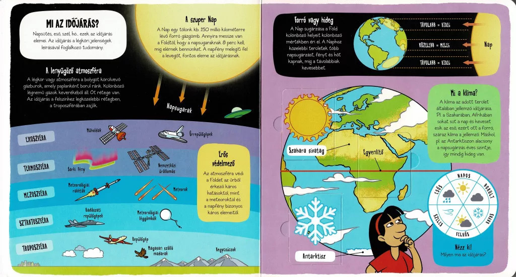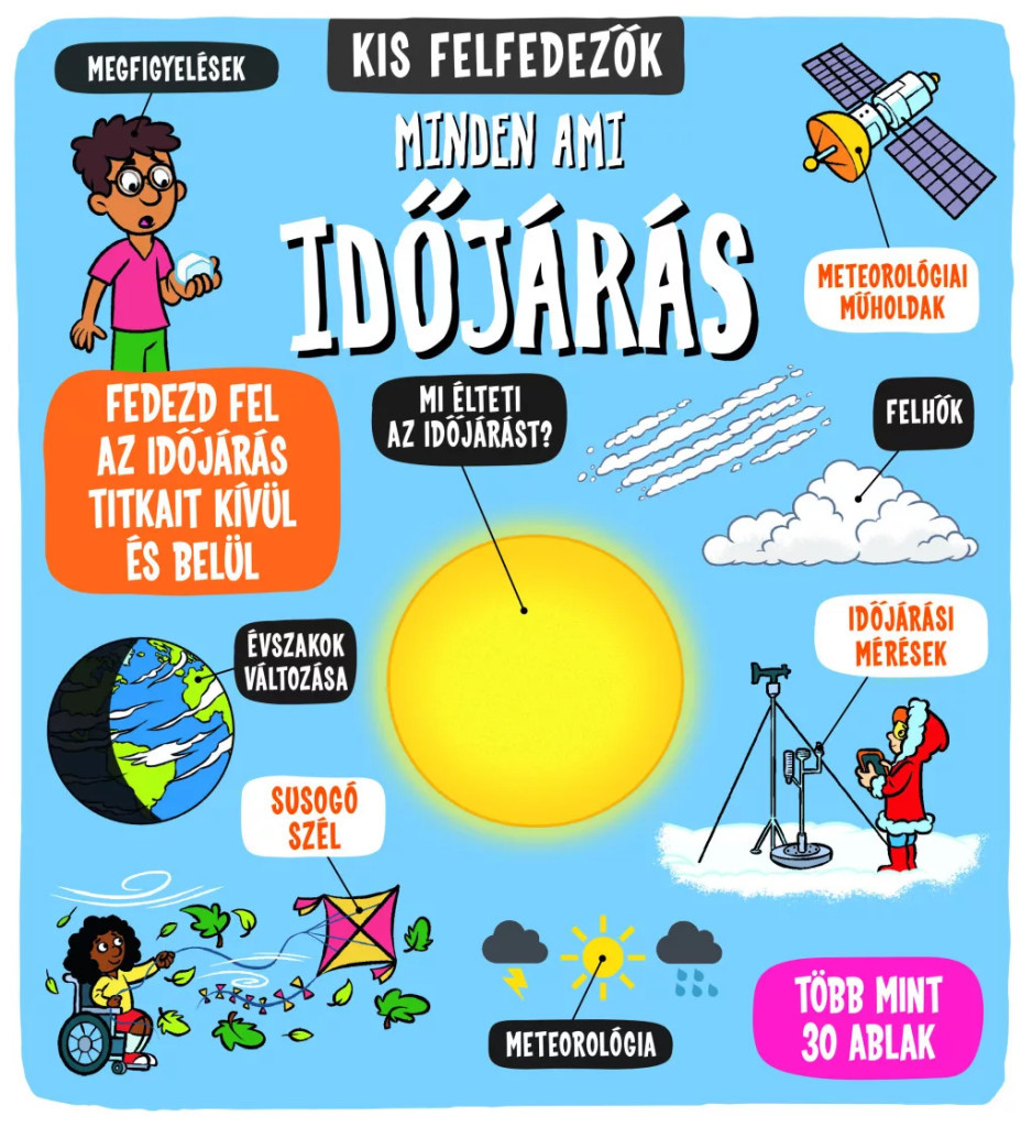 A könyvben a kis olvasók megismerhetik, hogyan alakul ki a napsütés, az eső, a szél vagy akár a hó, és megtudhatják, miért változnak az évszakok. Az illusztrációk segítségével könnyen érthetővé válik a klíma és a légköri jelenségek működése, miközben az apró felfedezők interaktív ablakokat nyithatnak ki, hogy még több érdekességet találjanak.
