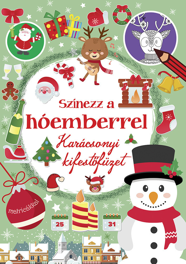 Kifestőfüzet tele karácsonyi témájú rajzokkal: télapóval, hóemberrel, gyerekekkel, karácsonyfával. A mellékelt matricákkal az oldalak még színesebbé tehetők.