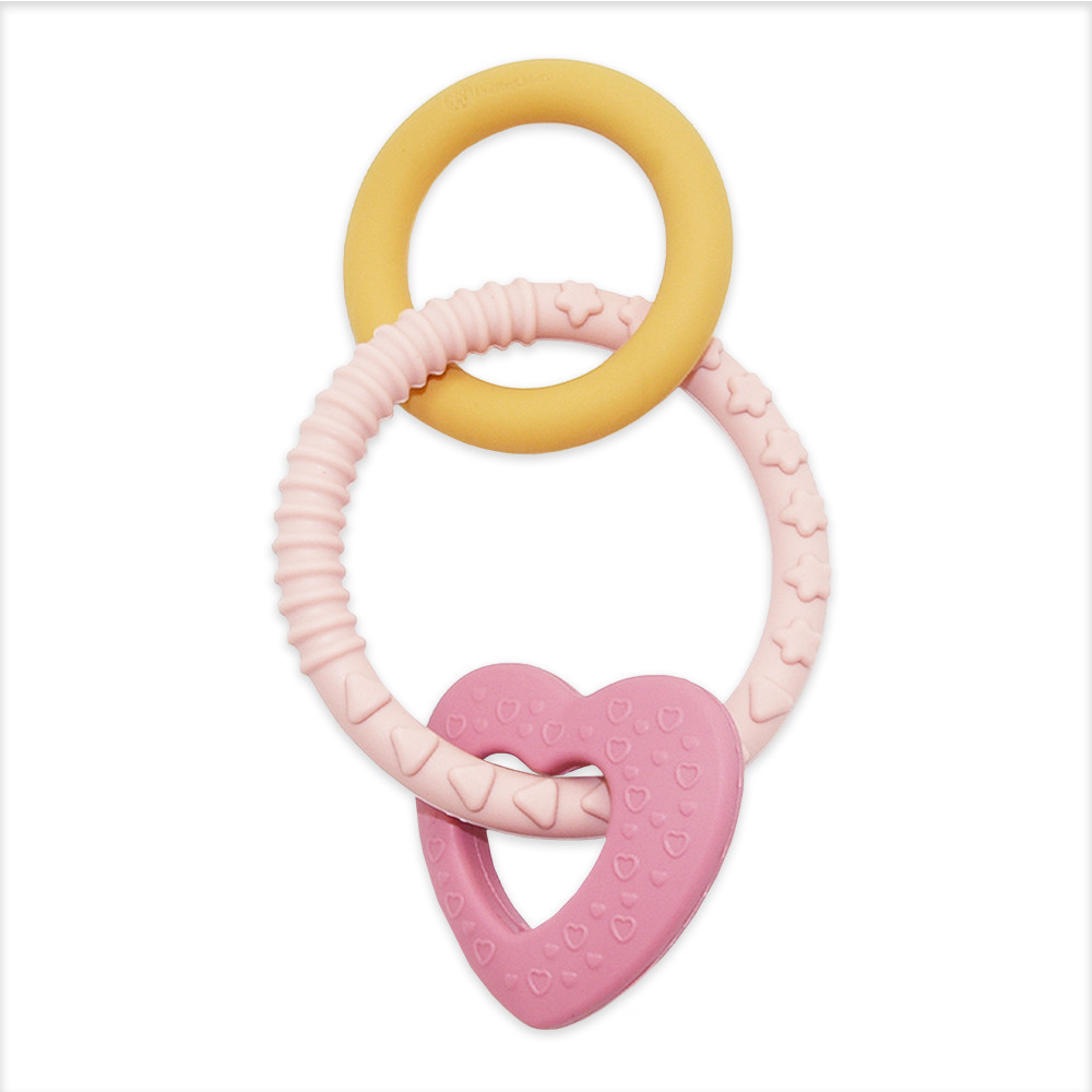 A szív alakú, puha, szilikon rágóka 3 izgalmas elemet tartalmazó gyűrűből áll. A legmagasabb minőségű, tartós anyagok garantálják babád biztonságát játék és fogzás közben. A rugalmas szilikon tökéletesen alkalmas csöppséged érzékeny ínyéhez.