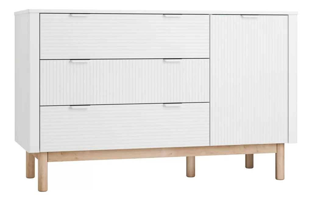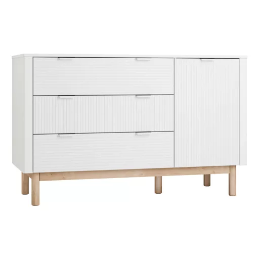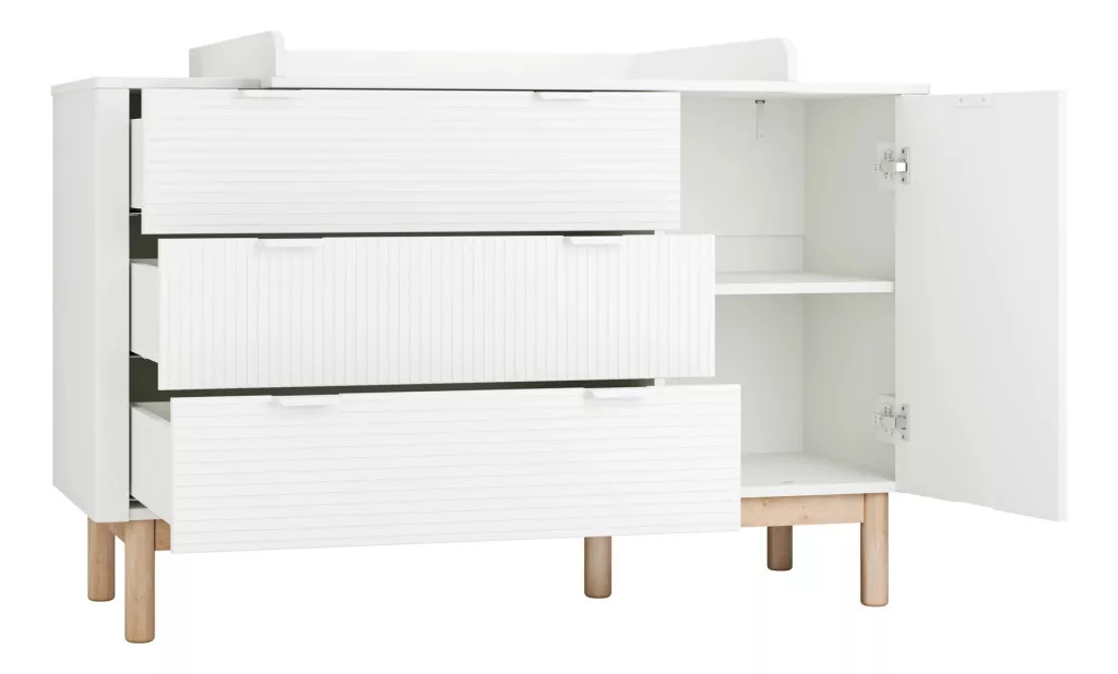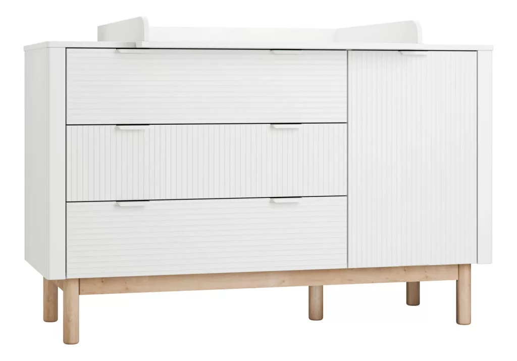 A Pinio Miloo White Plus stílusos komód három fiókkal és egy ajtóval rendelkezik, melyek kiváló minőségű sínekkel működnek, fékezéssel és lassúzárási funkcióval felszerelve. További kényelem érdekében választható hozzá egy levehető pelenkázó feltét.
