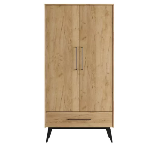 RETRO 2 ajtós szekrény divatos tetőtéri stílusban nemcsak elegáns formatervezési elem, hanem praktikus megoldás a ruhák és kiegészítők tárolására is. A szekrény kiváló minőségű csendes zárórendszeramely biztosítja a használat kényelmét és kiküszöböli a zajt az ajtók kinyitásakor és bezárásakor. A szekrény belsejét a maximális funkcionalitás szem előtt tartásával tervezték. Benne vannak két polcamelyek lehetővé teszik a tárolt elemek szétválasztását és szervezését. Ezen felül a szekrény rendelkezik ruhák lógó rúdami megkönnyíti a rend tárolását és fenntartását a szekrényben. Tágas fiók, kiváló minőségű vezetőkkel felszerelt, biztosítja a sima és csendes bezárást, ami növeli a szekrény használatának kényelmét.