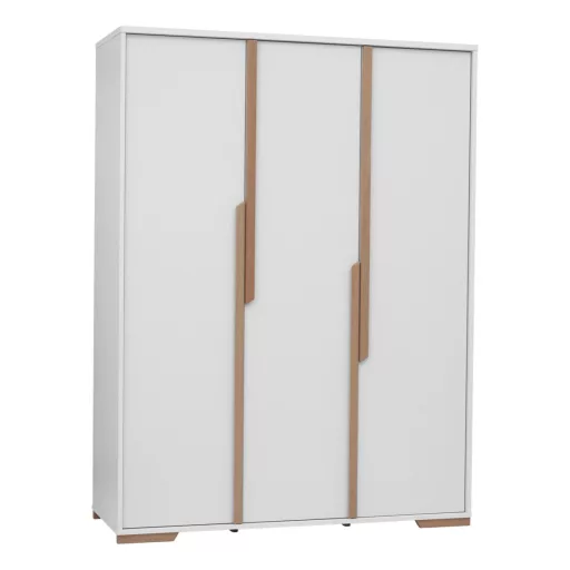 Nagyon tágas, 3 ajtós szekrény, csendes zárórendszerrel. Belül két függőleges válaszfal és különféle lehetőségek a szekrény belsejének elrendezésére. Négy polc és egy bot. Az SNAP kollekció időtlen bútorkészlet gyermekek és fiatalok számára. A bútor fehér volt.  Az SNAP kollekcióból származó bútorok esztétikát adnak és hangsúlyozzák egyedi stílusukat. A modern és egyszerű formák hangsúlyozzák a test jellegét. Érdemes figyelni a részletekre, például a bükkbetétekre. Minden bútor a legmagasabb minőségű laminált bútordarabból készül, ellenáll a sérüléseknek és a kopásoknak, festett fa és tömör bükkfa.