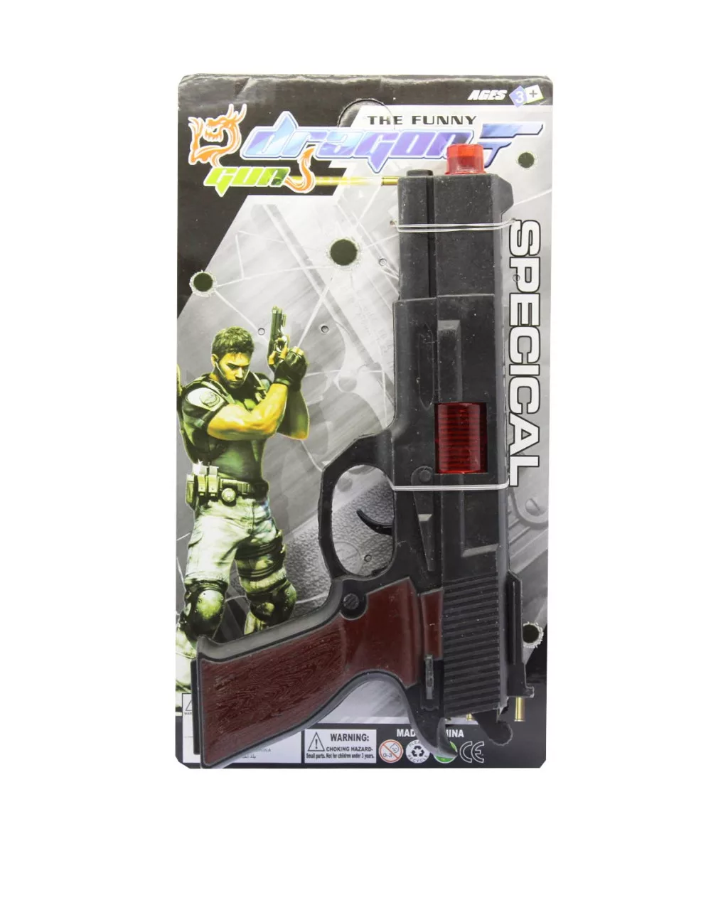 A fegyver nem játék, jó ha hamar megtanulod. Ezzel a pisztollyal nem tehetsz kárt senkiben, de egy farsangi jelmeznek jó kiegészítõje lehet. Mechanikusan pörgõ hangot ad. Csak 3 év feletti gyermek számára adható. Csomagolása kartonon, 16*29 cm.