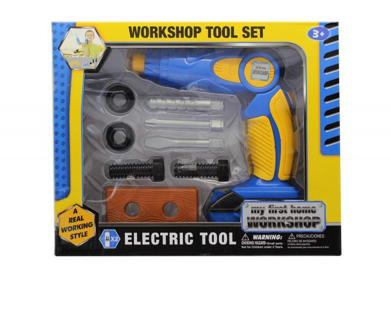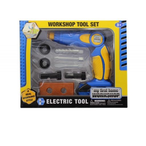 Szerszámgép készlet, furó, elemes(2xAA), forog és világít, cserélhetõ fejjel, 27x22 cm dobozban